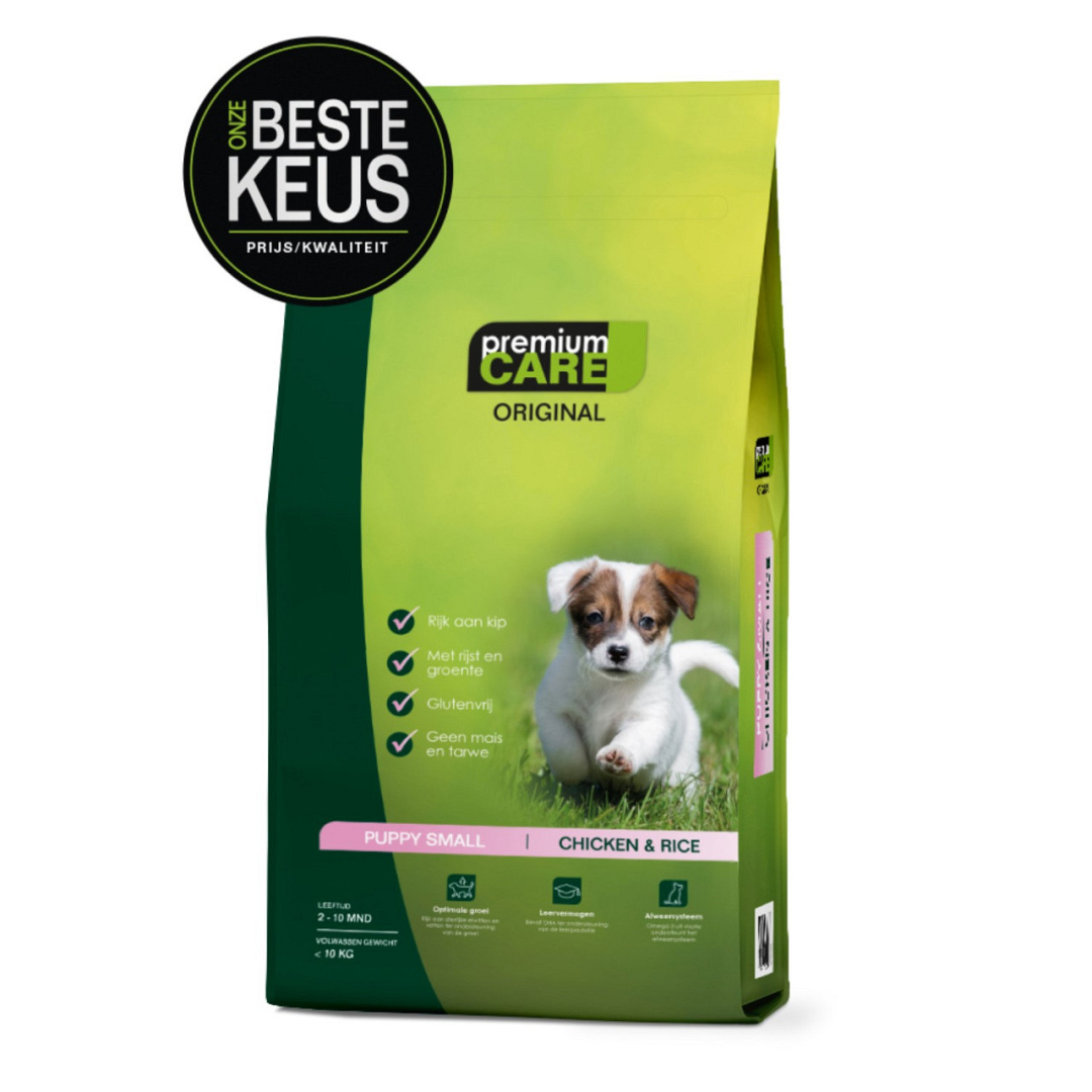 Premium Care Original - Puppy Small Chicken & Rice is een glutenvrije, complete droge hondenvoeding speciaal samengesteld om te voorzien in de voedingsbehoeften van pups van kleine rassen en draagt bij tot hun optimale ontwikkeling.
