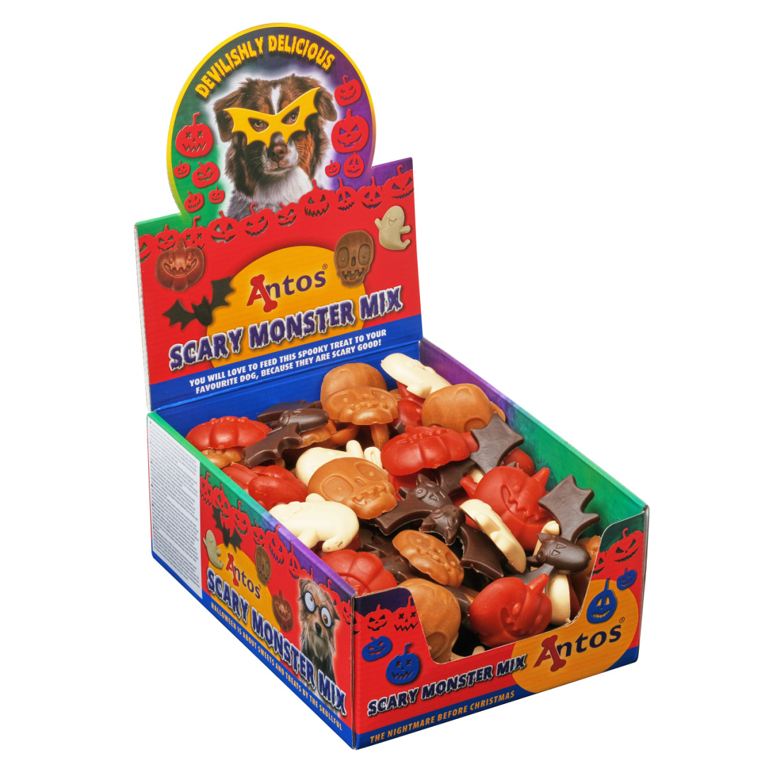 Hondensnacks Antos Scary Monsters hebben de kracht om elke hond die ervan proeft te betoveren. Je kunt je hond het seizoen laten proeven met griezelig lekkere snoepjes in de vorm van pompoenen, vleermuizen, spoken en schedels. Laat je hond schrikken van hoe lekker deze duivelse hondensnacks zijn.
