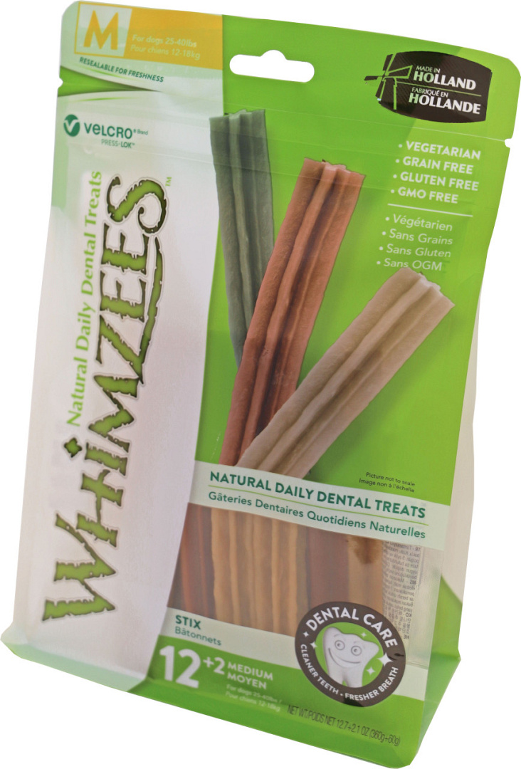 De WHIMZEES stix is een kauwsnack welke dagelijks gegeven kan worden en is speciaal ontwikkeld om het gebit schoon te houden tijdens het kauwen. De gepatenteerde groeven en vormen komen tussen de tanden van de hond en helpen op deze manier tandplak en tandsteen voorkomen.