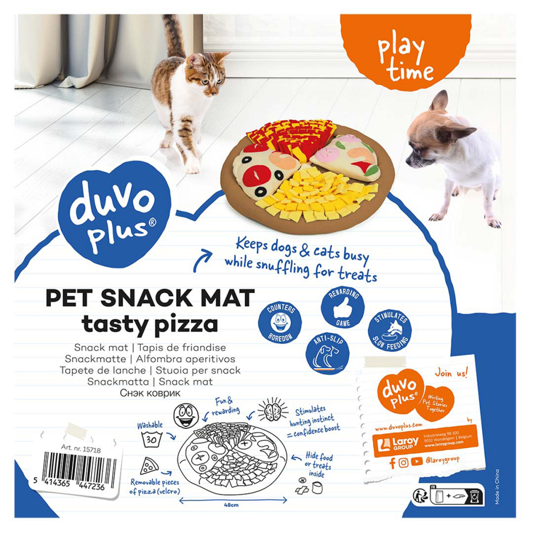 Verstop de favoriete snacks van je kat of hond op de Duvoplus snackmat. Door deze snacks te verstoppen in de mat komt het voedsel in allerlei kleine hoekjes terecht. Dit zorgt ervoor dat het jachtinstinct van je kat of hond gestimuleerd wordt, aangezien het een uitdaging is voor je huisdier om de snacks te vinden.