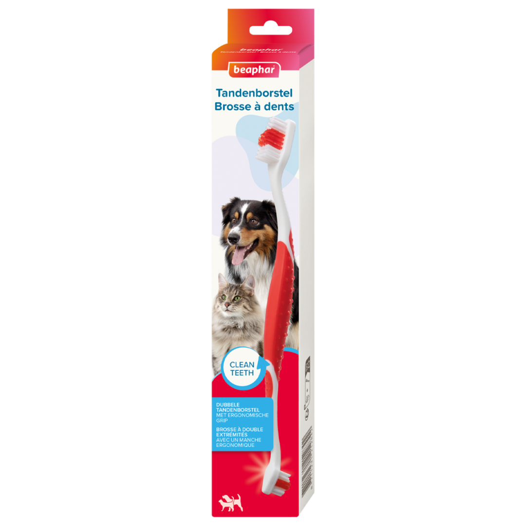 Dubbelzijdige tandenborstel afgestemd op de unieke vorm van de tanden van je hond of kat.