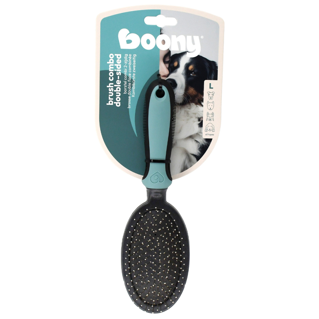 Met deze praktische Boony 2-zijdige combi-borstel heb je twee essentiële borstels in één handig product. Ideaal voor hondenbezitters die gemak, effectiviteit en veelzijdigheid zoeken. De borstel combineert een nylon zijde voor het verwijderen van vuil en een stalen zijde voor het losmaken van dode en losse haren.