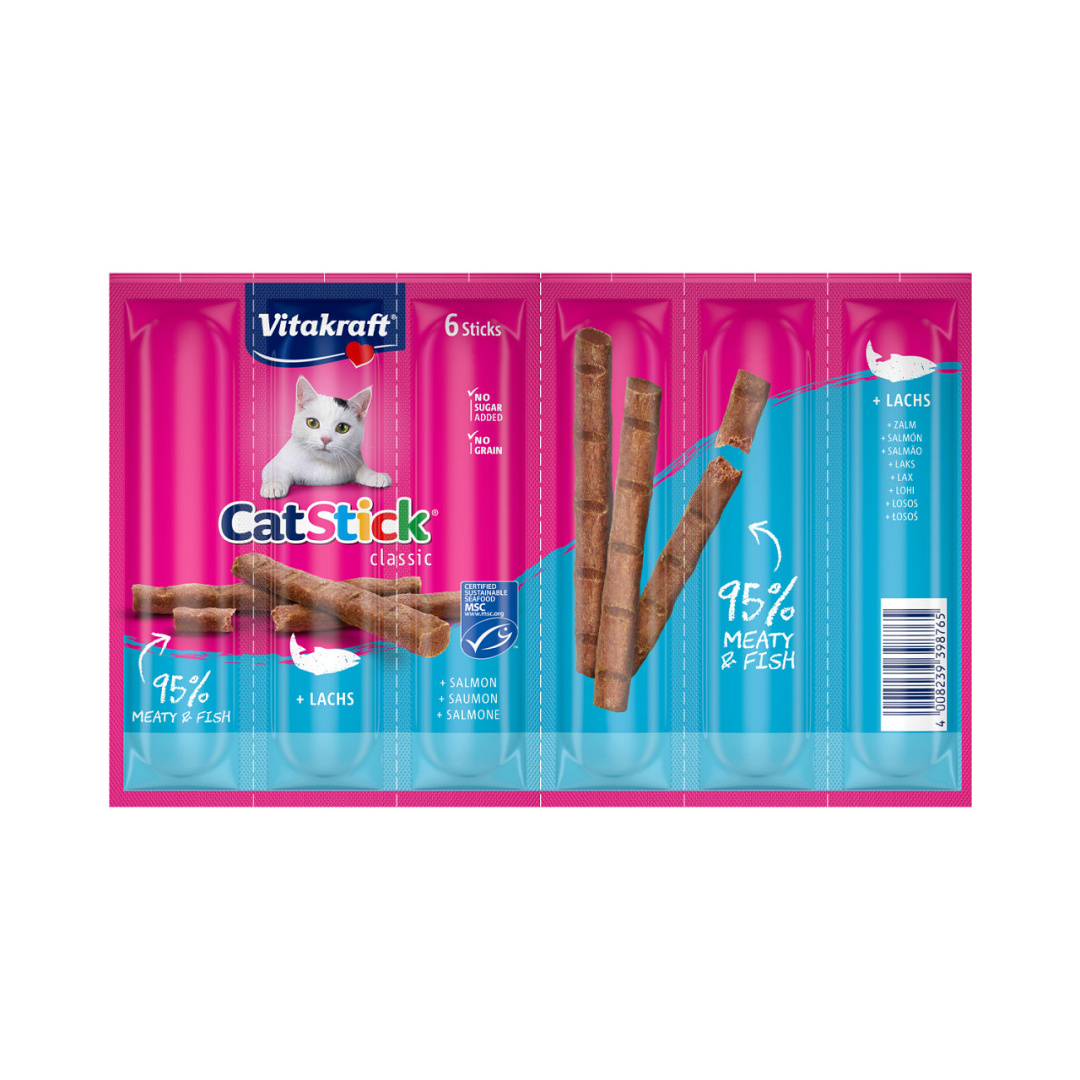 De populaire Vitakraft Cat Stick met zalm overtuigt met topkwaliteit, een extra hoog visgehalte (95%), een suikervrije receptuur, een unieke, onweerstaanbare smaak en bevat geen kleurstoffen en smaakversterkers.