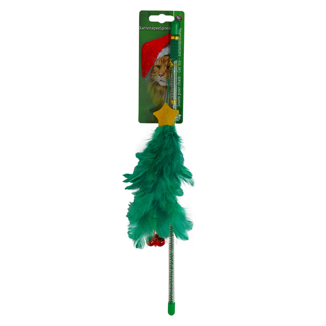 Laat je kat meedoen aan de kerstsfeer met deze speciale kerst kattenhengel! Aan deze feestelijke hengel danst een prachtige kerstboom, gemaakt van weelderige groene veren, fonkelende rode belletjes die doen denken aan kerstballen, en een stralende gele ster verwerkt in het elastiek. Elk detail roept de charme van een traditionele kerstboom op, terwijl het spelenderwijs de jachtinstincten van jouw kat prikkelt. Of het nu gaat om dartelende sprongen of nieuwsgierige blikken, deze hengel brengt plezier en beweging met een feestelijke flair. Verras je kat met het ultieme kerstcadeau en deel samen de magie van de feestdagen.