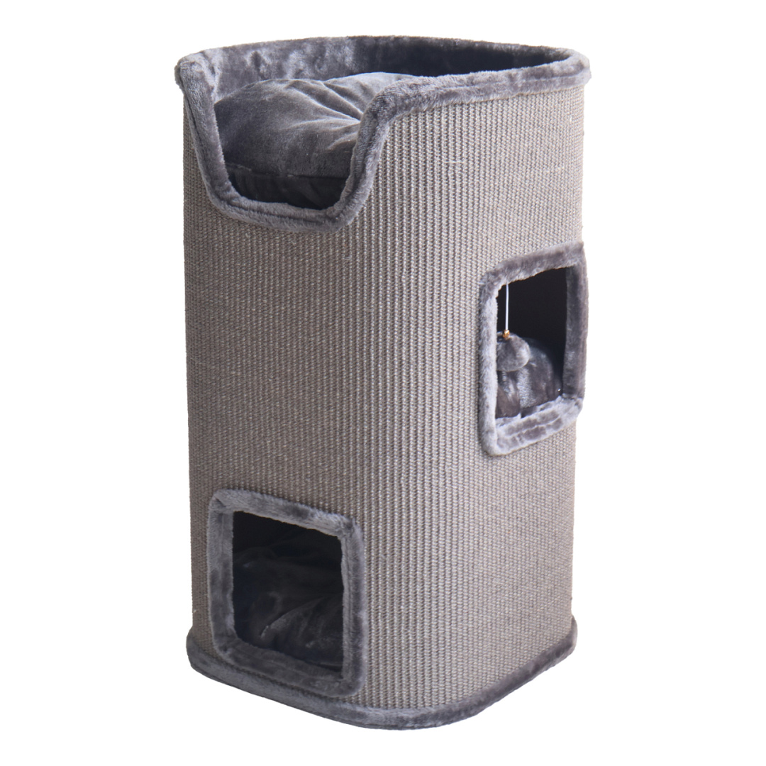 Deze krabtoren is de ideale combinatie tussen een krabgelegenheid en een slaapplaats. Dit product is namelijk voorzien van maar liefst drie slaapplekken. Alle drie de slaapplekken zijn voorzien van een zeer comfortabel uitneembaar kussen. De met sisal beklede buitenzijde van dit product geven jouw kat voldoende gelegenheid zijn of haar nagels te scherpen om zo zijn natuurlijke krabbehoefte te stimuleren. Een van de slaapplaatsen is ook voorzien van een balletje met elastiek, waar jouw kat naar hartenlust mee kan spelen.