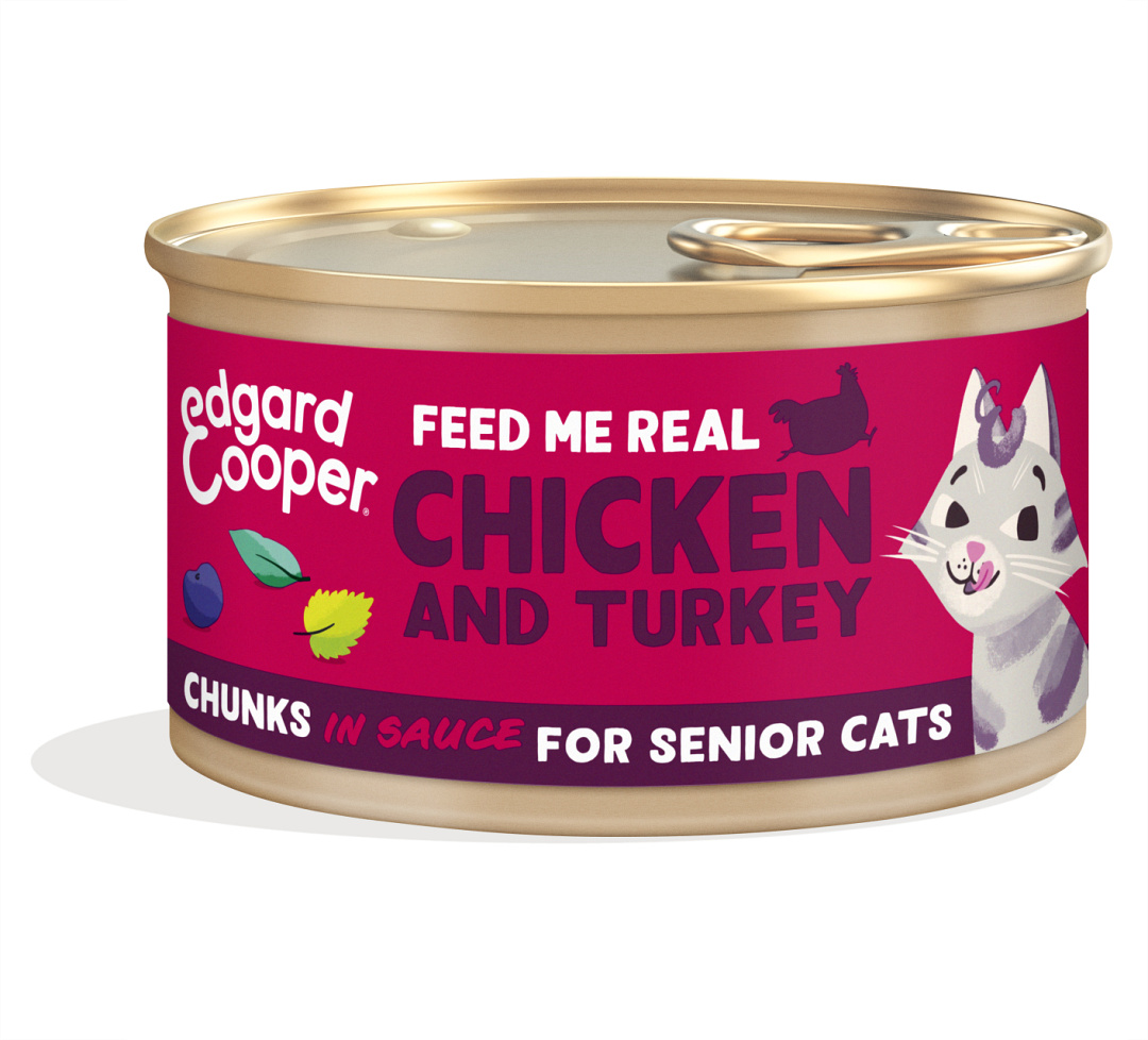 Edgard & Cooper kattenvoer Senior Kip en Kalkoen Chunks in saus zijn malse stukjes vrije-uitloopkip en kalkoen overgoten met een saus. Dit is een recept met echt eten zonder junkfood: boordevol magere eiwitten, L-carnitine voor het behoud van spiermassa en taurine die de ogen en het hart van je senior gezond helpen houden.