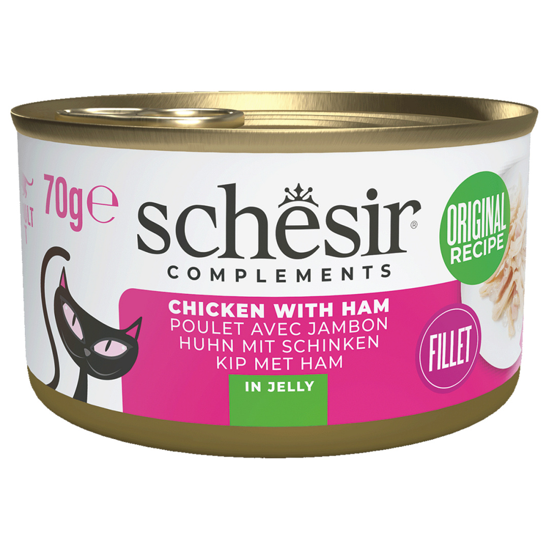 Schesir kattenvoer Complements kip en ham in gelei is een aanvullend voer en ideaal om te combineren met droogvoer. Combineer brokjes met deze verse gestoomde kipfilets met ham. Perfect als aanvulling op de voeding van jouw kat. Deze aanvullende voeding in gelei zal zeker favoriet zijn bij katten die dol zijn op natuurlijke smaken.