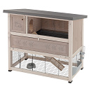 Luxe konijnenhok van hoogwaardig Noors dennenhout, met sfeervolle decoraties.