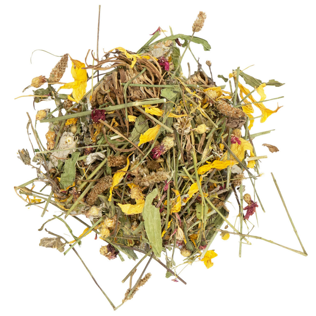 JR Farm Bloemendroom is niet alleen een lust voor het oog, maar vooral een feest voor de smaakpapillen van jouw kleine huisdier. Met de frisse anijsachtige smaak van dille voor een sterke maag, korenbloemen en zonnebloemblaadjes die ontstekingen helpen remmen en smalle weegbree die de luchtwegen kalmeert. Selderij en paardenbloem stimuleren de stofwisseling met hun natuurlijke vitaminen, terwijl frambozenblad waardevolle mineralen levert. En als kers op de taart zorgen kamillebloemen voor rust in het hele spijsverteringsstelsel. Een natuurlijk wellnessmoment voor konijnen, cavia's, hamsters en andere kleine fijnproevers!