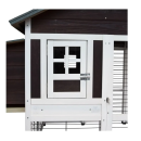 Het kippenhok staat op stevige plastic poten en is van binnen verdeeld in twee aparte ruimtes. De eerste ruimte is een hut voor het verzamelen van eieren, uitgerust met een zijdeur die open kan met veiligheidsslot. De tweede ruimte bestaat uit een groter gebied compleet met zitstok, vuilopvangbak en metalen rooster, dat helpt het binnenmilieu schoon te houden door te voorkomen dat vogels in contact komen met vuil. Een handige houten ladder zorgt ervoor dat de kippen gemakkelijk op- en af kunnen stappen de grote ren in. De toegangsdeur is verschuifbaar.
